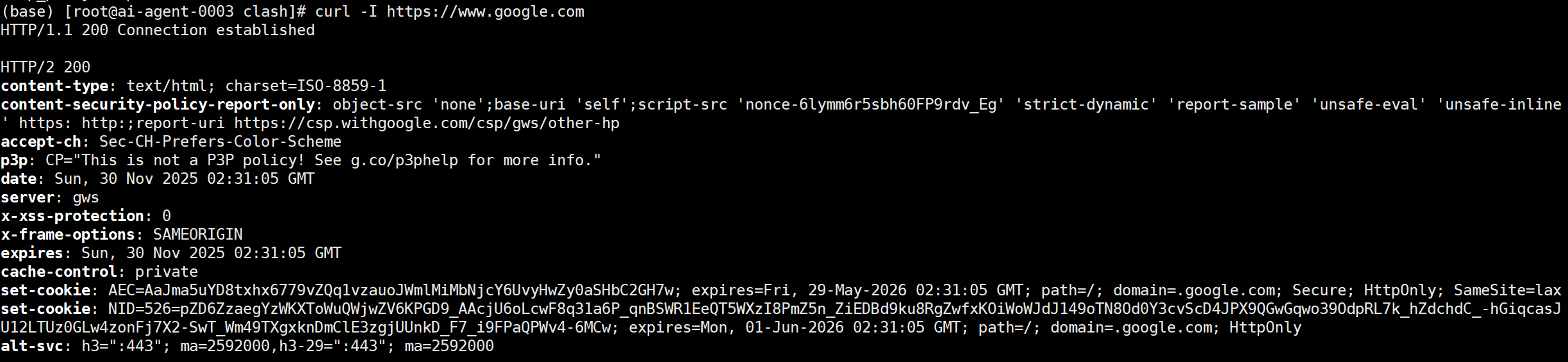 # 测试 Google 连接(如果返回 http 200成功码和HTML 代码则成功)