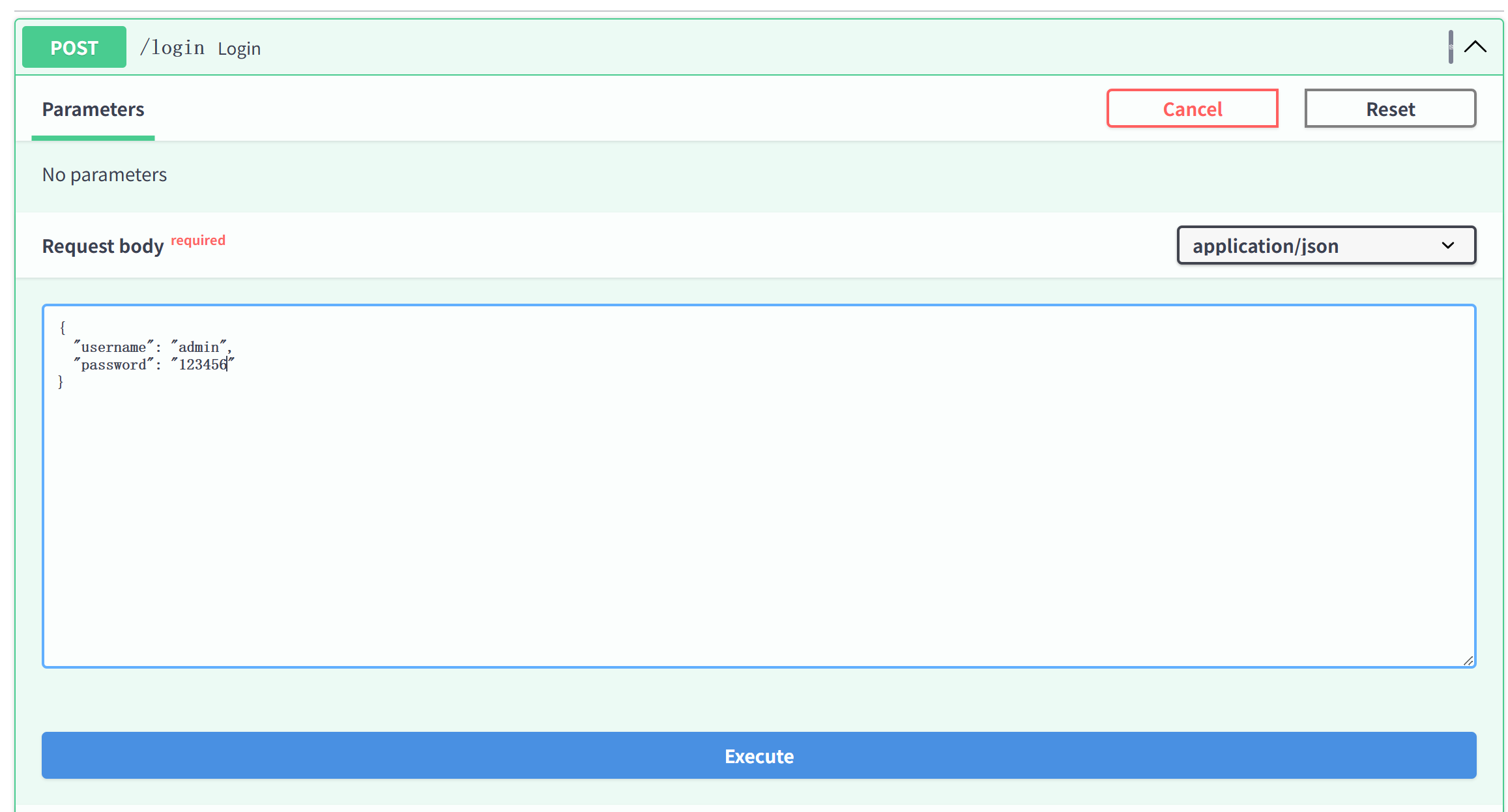 /login,然后点击Try it out,编辑用户名和密码,输入账号admin和密码123456,点击Execute。你会得到两个长长的字符串。 执行: